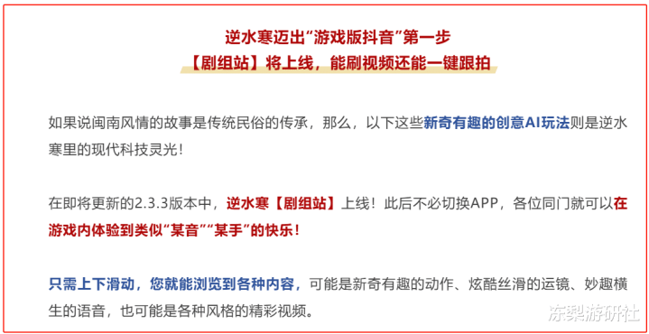 根据网易表示,在4月25日新版本上线后,逆水寒手游将上线剧组站功能。玩家们可以在不切换APP的状态下就在游戏内体验到类似抖音刷视频的乐趣,只需要上下滑动就能浏览玩家们利用剧组模式所生成的各种短视频内容,可能是新奇有趣的动作、炫酷丝滑的运镜、妙趣横生的语音,也可能是各种风格的精彩视频。